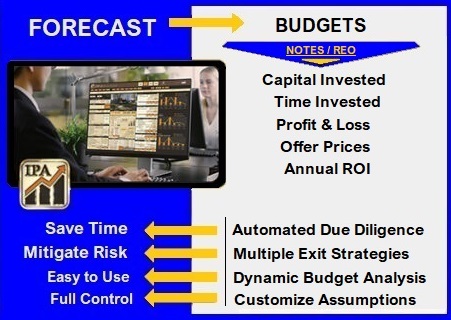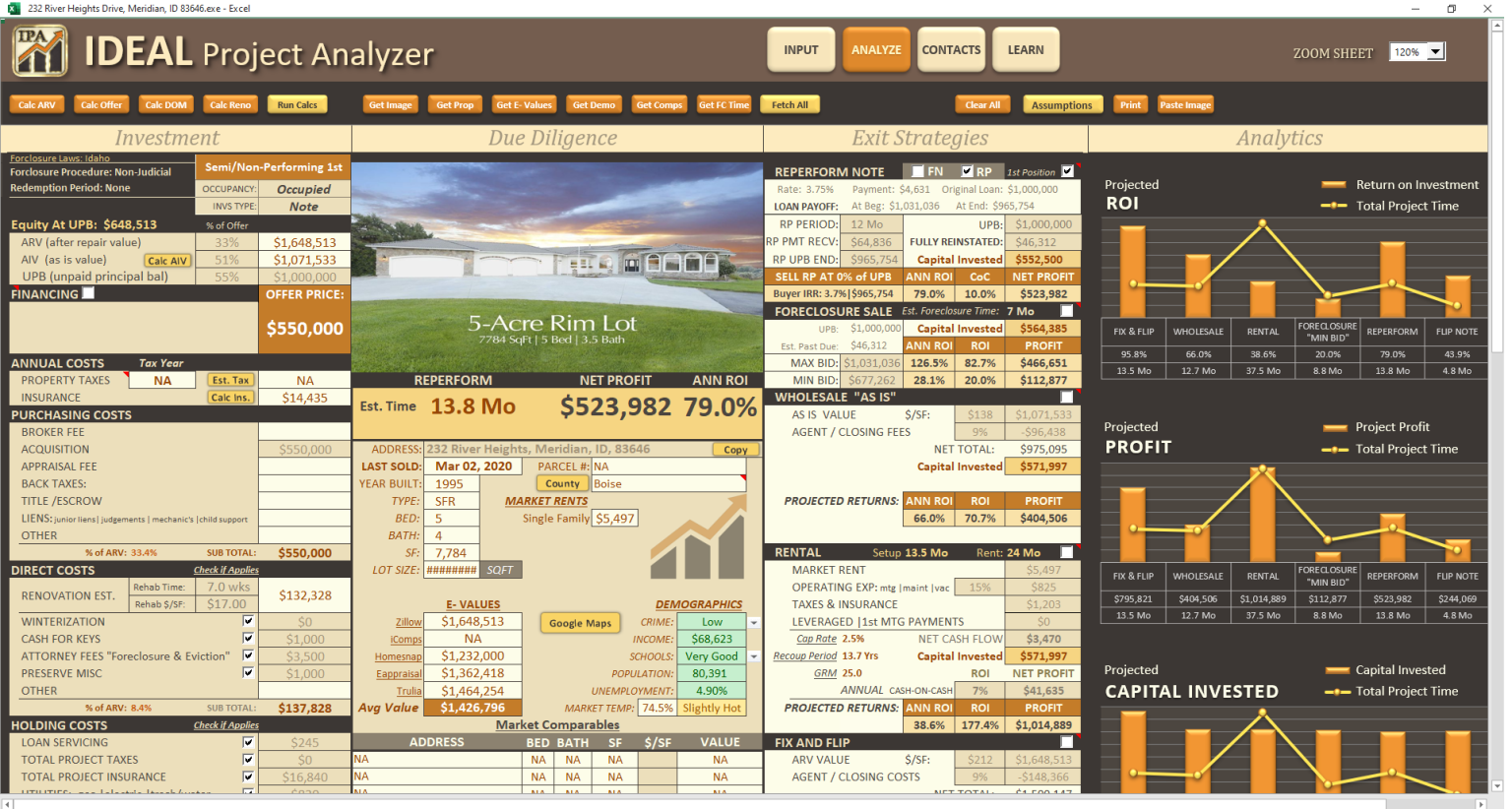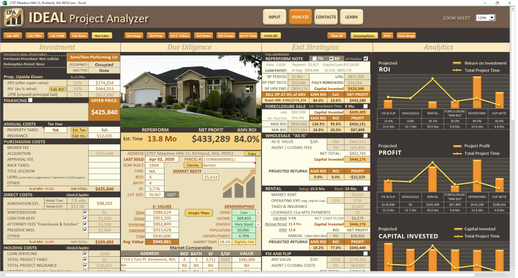 The IDEAL Project Analyzer (IPA) is a sophisticated Excel template that can analyze and manage the investment performance of Non-Performing Notes or REO against multiple exit strategies. From a single view, you can easily calculate project costs, estimate time, collect due diligence, manage contacts, enter notes, analyze multiple exit strategies, and learn as you invest from a series of video tutorials, live weekly webinars, and a glossary of terms.