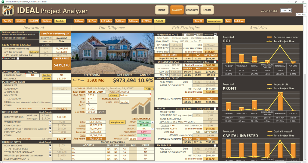 THE IDEAL Project Analyzer (IPA) is a sophisticated Excel template that can analyze and manage the investment performance of Non-Performing Notes or REO against multiple exit strategies. From a single view, you can easily calculate project costs, estimate time, collect due diligence, manage contacts, enter notes, analyze multiple exit strategies, and learn as you invest from a series of video tutorials, live weekly webinars, and a glossary of terms.