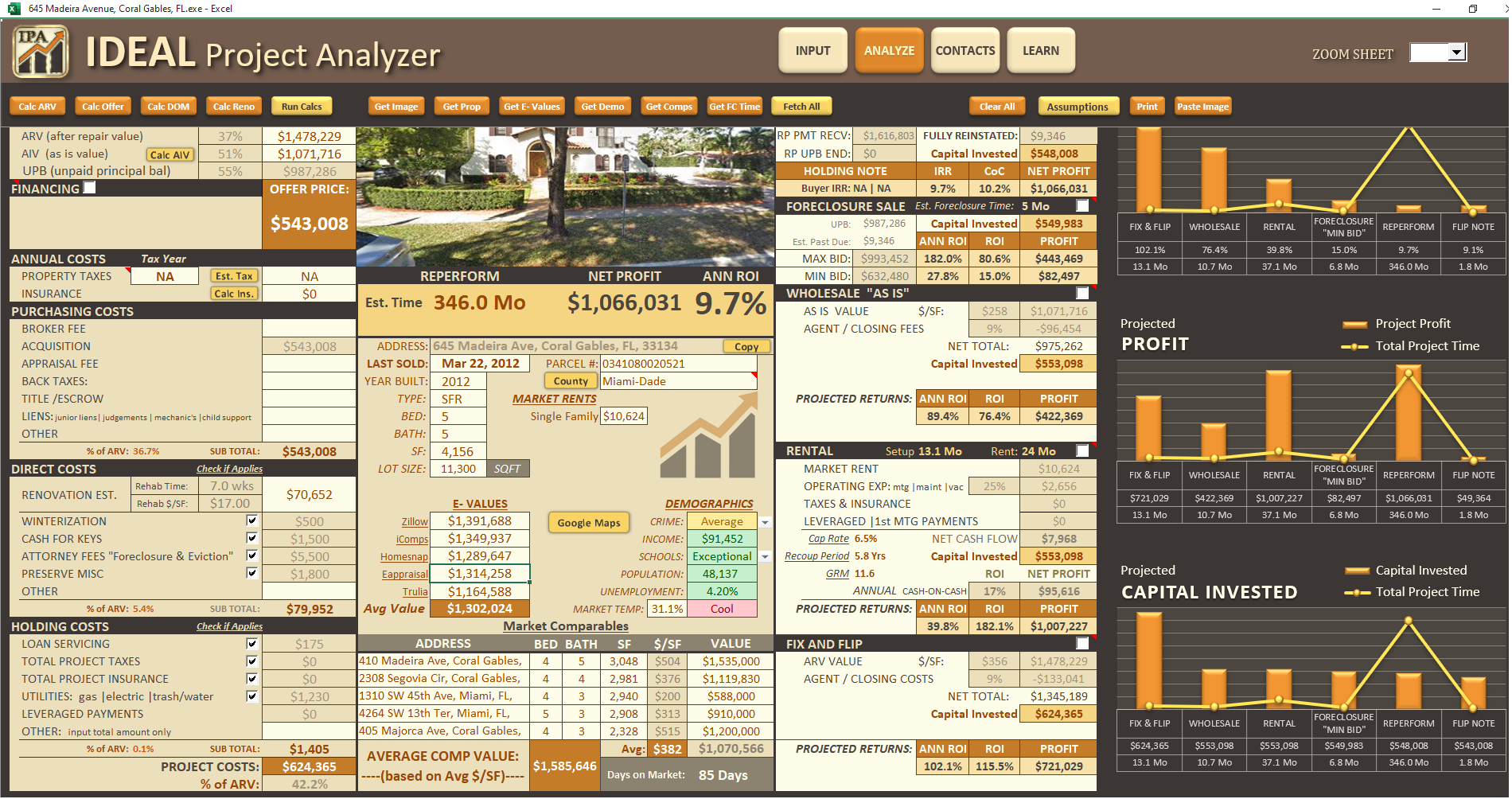 Determine property values and offer prices. All in one view. analyze your capital invested, time tables. profit margins and rate of returns. Customize all assumptions to meet your investment need. Everything is automated and will change dynamically. Leverage your capital and see side by side comparisons.